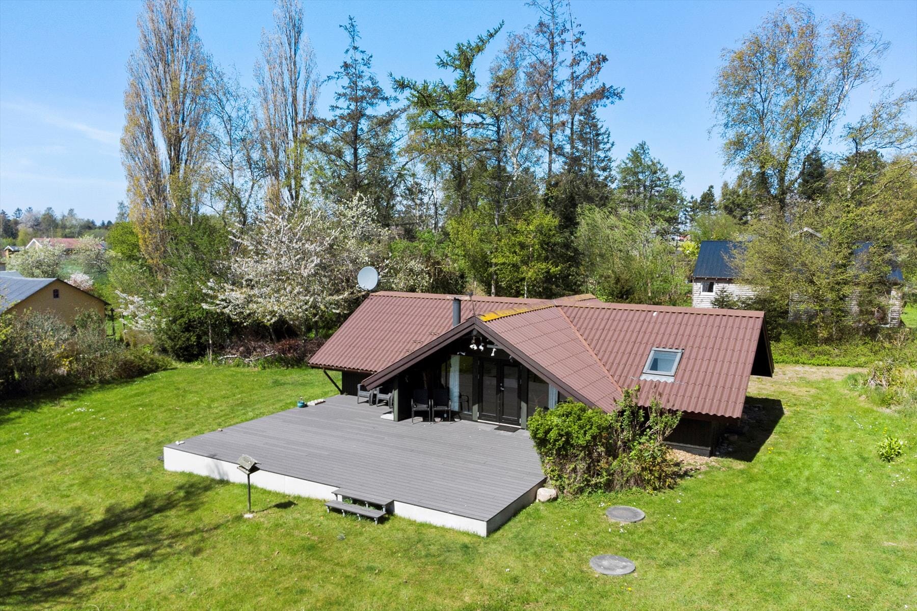 Dit vakantiehuis ligt op een groot perceel van ca. 1680 m2 en is mooi beplant met een gedeeltelijk overdekt houten terras met tuinmeubelen.