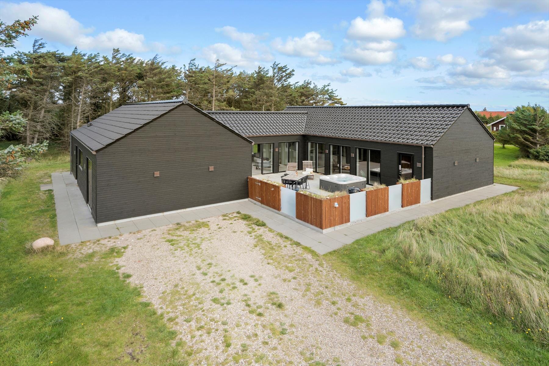 Outdoor living is a key part of the experience at this holiday home. The large, enclosed terrace is a true oasis for those who enjoy being outside – with plenty of room for sunbathing, cosy meals and play. As the icing on the cake, the inviting outdoor spa is ready to pamper you. Imagine a summer evening, sitting in the warm water with a glass of wine in hand, as the stars light up the sky one by one. Or maybe a quiet morning, starting your day with a hot soak and birdsong in the background. The terrace is fully enclosed, so both small children and dogs can roam safely, and you can enjoy the peaceful surroundings – perhaps with a good book or simply your feet up.