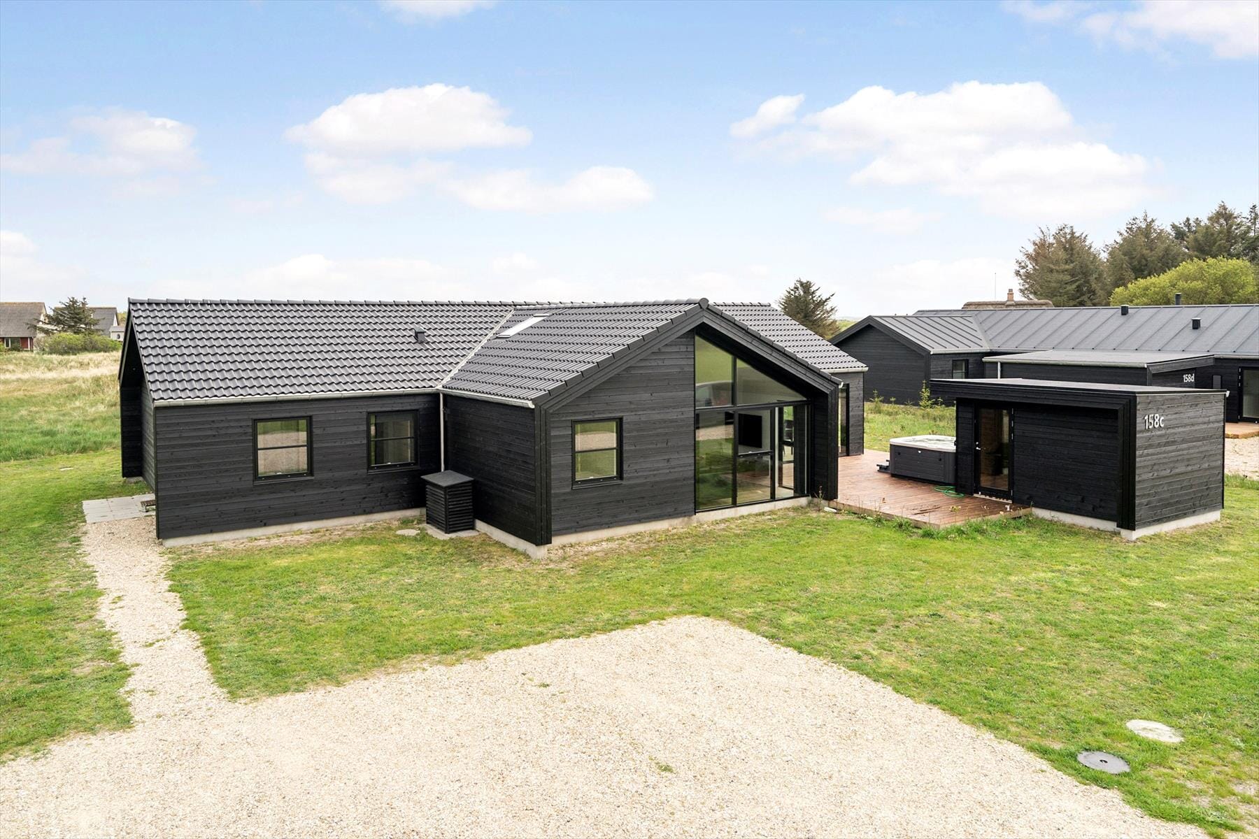 Built in 2022, the holiday home boasts a bright and spacious atmosphere, with high ceilings and large windows letting in plenty of natural light. The five bedrooms are furnished with comfortable beds—three with double beds and two with single beds—providing space for up to ten people. The two bathrooms are strategically placed at opposite ends of the house, with the larger one featuring a sauna and direct access to the terrace, where an outdoor shower and hot tub await. The living area combines a kitchen, dining area, and living room in one open space, ideal for shared cooking and cozy evenings in front of the flat-screen TV. The adjacent activity room with a pool table ensures entertainment for all, while the sunroom with flexible glass panels allows you to enjoy nature regardless of the weather.
